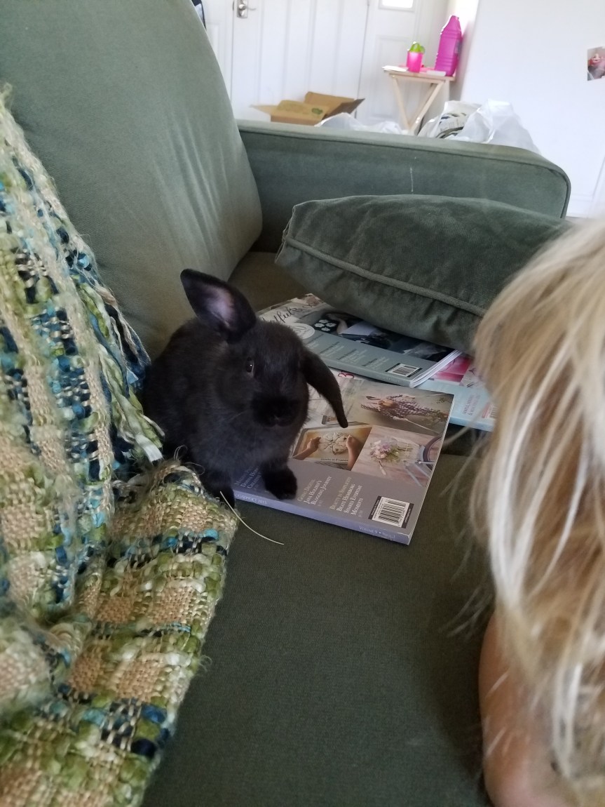 So here is our new bunny, tentatively named Parsnip. He’s been chilling on the sofa with me this evening and has even been patient with the Angelica’s high energy and exuberance. Thus far I like him. He has a sweet disposition, and he is as calm and relaxed as he is playful and fun. At 7 weeks old, he’s still a baby and quite small. Because of this it may be too early to know his nature, but what I see at this point is really quite encouraging. He’s patient, kind, and companionable.